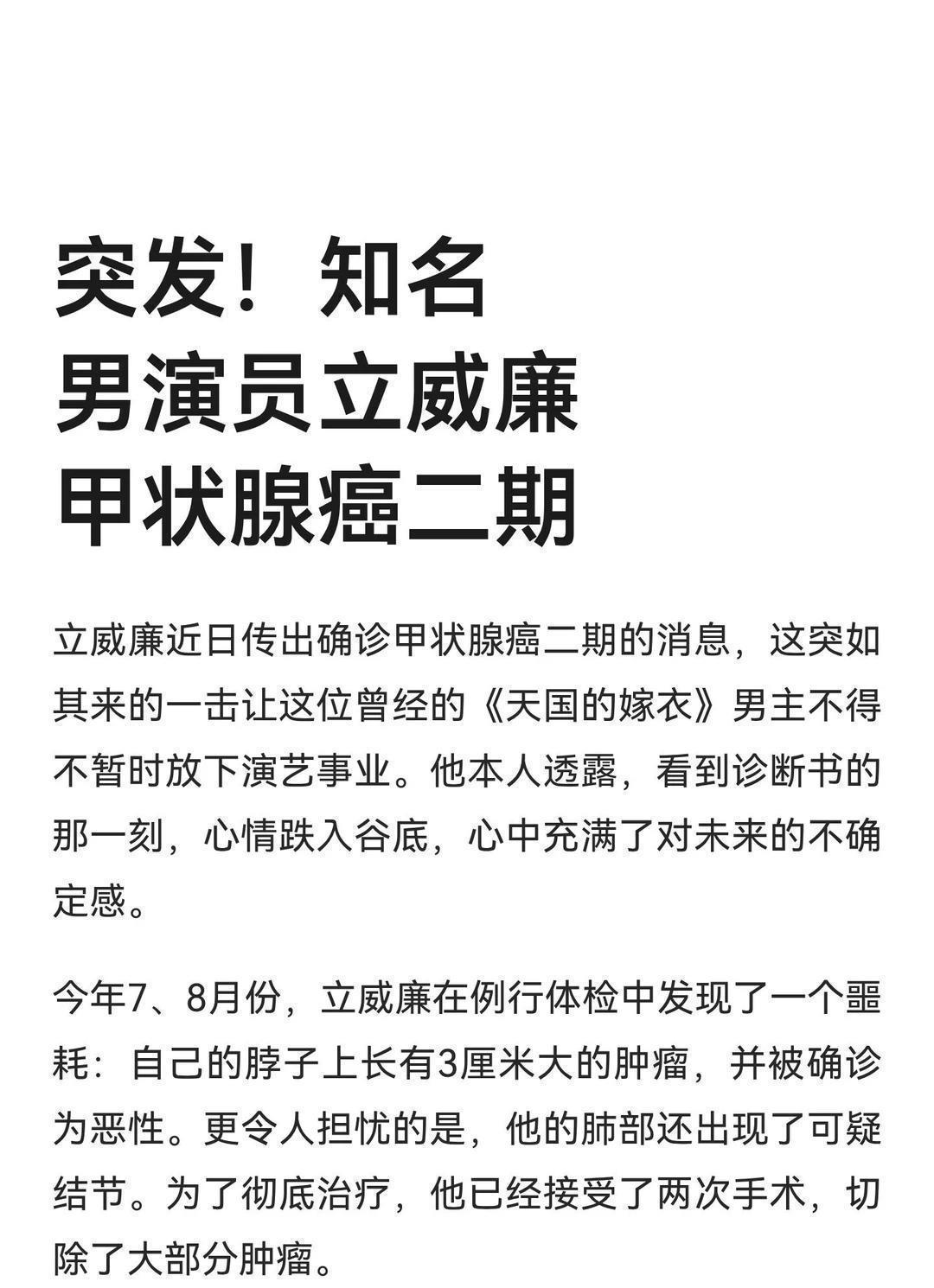 最近有个消息,攥在不少80后、90后心里一跳:曾经的偶像剧男神立威廉,被查出患上了甲状腺癌。据媒体说,今年七八月份,他被确诊为癌症二期,九月份又连续做了两次手术。当拿到检查报告那一瞬,这位在屏幕上一直优雅自若的“王子”,顿时觉得眼前一阵发黑,脑海中蹦出的第一个想法就是:“我还能不能看到我女儿长大呢?”